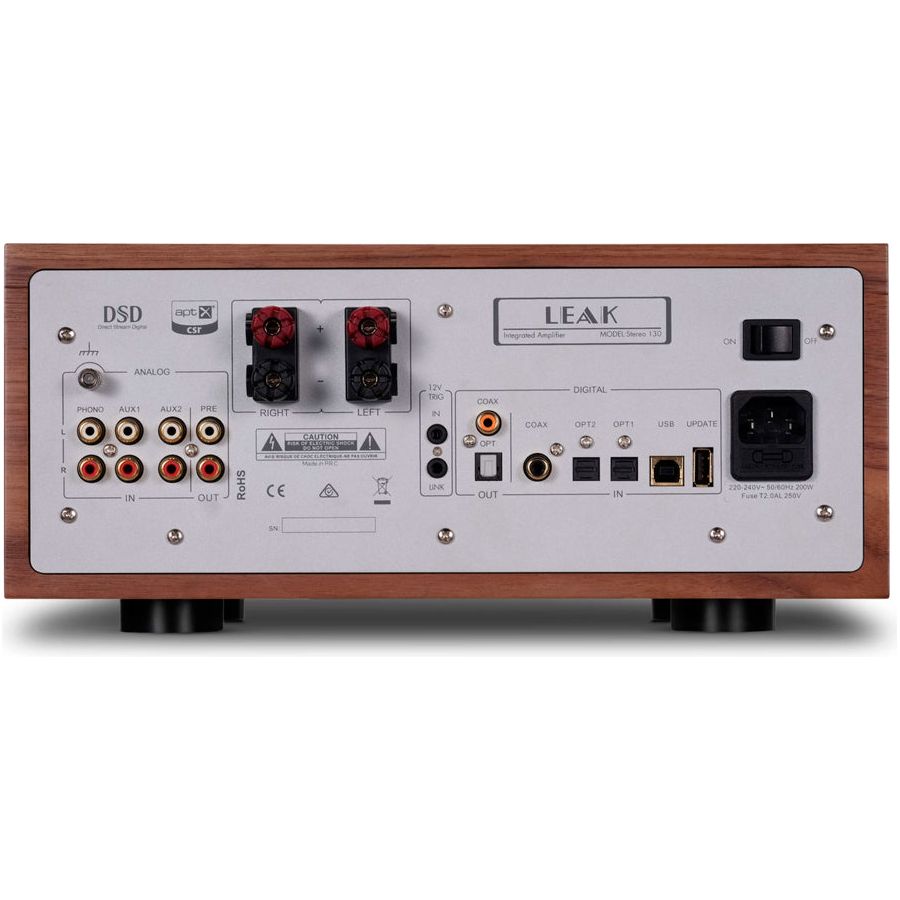 Descendiente directo de un gran clásico de LEAK (el amplificador integrado estereofónico Stereo 30), el Stereo 130 es una bella electrónica de 2x45 vatios continuos en Clase AB sobre 8 ohmios cuyo diseño industrial replica a la perfección al de las electrónicas “vintage” de la firma británica, cuya elegancia se refuerza todavía más con la adición de su recinto opcional fabricado en madera natural.