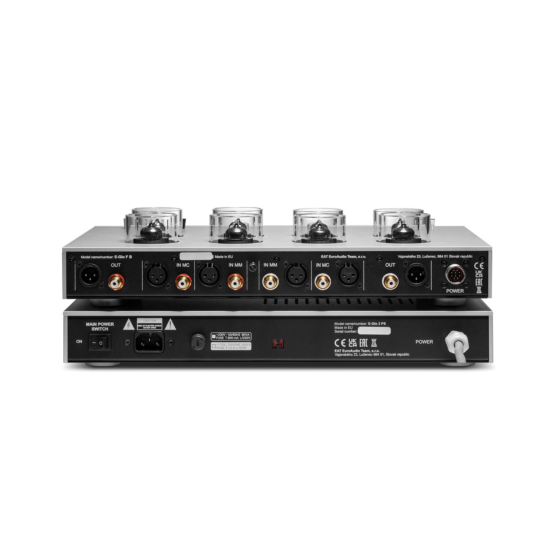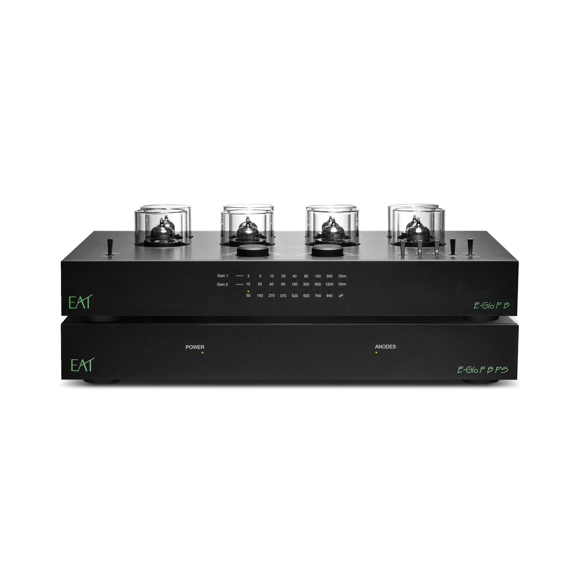 Con una arquitectura basada exclusivamente en válvulas de vacío, en la que destaca la total ausencia de semiconductores en el trayecto recorrido por la señal de audio, el E-Glo F B añade dos de los versátiles dobles triodos ECC88 a su circuitería con respecto a la del modelo original, con la finalidad de ofrecer un diseño completamente balanceado y un funcionamiento también 100% balanceado en todas sus etapas de amplificación.