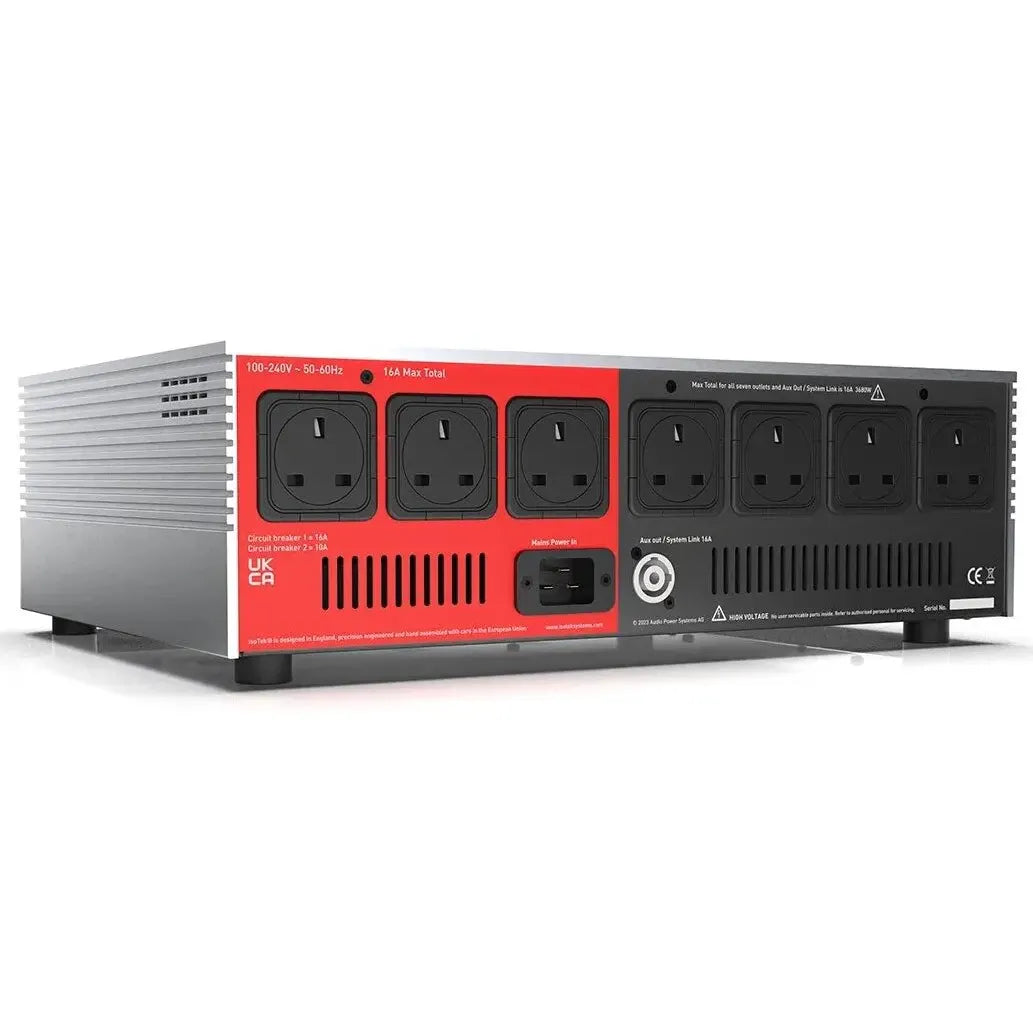 El dispositivo integra siete circuitos independientes de limpieza de corriente, uno para cada toma, lo que evita la contaminación cruzada entre los diferentes componentes del sistema. Esta arquitectura permite reducir significativamente el ruido eléctrico tanto en modo diferencial como en modo común, mejorando la pureza de la señal que reciben los equipos conectados.